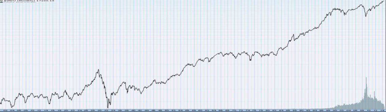 ne of the tools used by Wall Street’s so-called “technicians” involves the study of short-term price charts, looking for patterns that will help them divine the future movement of a stock or the markets (a practice panned as “hocus-pocus” by serious investors). We, on the other hand, have always found it truly useful to ponder a long-term graph of a market index such as the Dow Jones or S&P-not to predict the future, but to see where we’ve been and what obstacles had to be overcome to get here. It is also instructive simply to see the kinds of things that happen over decades of market history. The longer the time period the better-a century is good, since the further back you go the more unreliable the data becomes. One hundred years also provides a good picture of practically all possible market events (at least in the U.S.), from catastrophic plunges in the early 1930s, or brief crashes (as in 1987), to raging bull markets (as in the 1950s or 1980s, and more recently in the 2010s). Each episode of this history had its own story, which led to subsequent segments of the long-term drama.